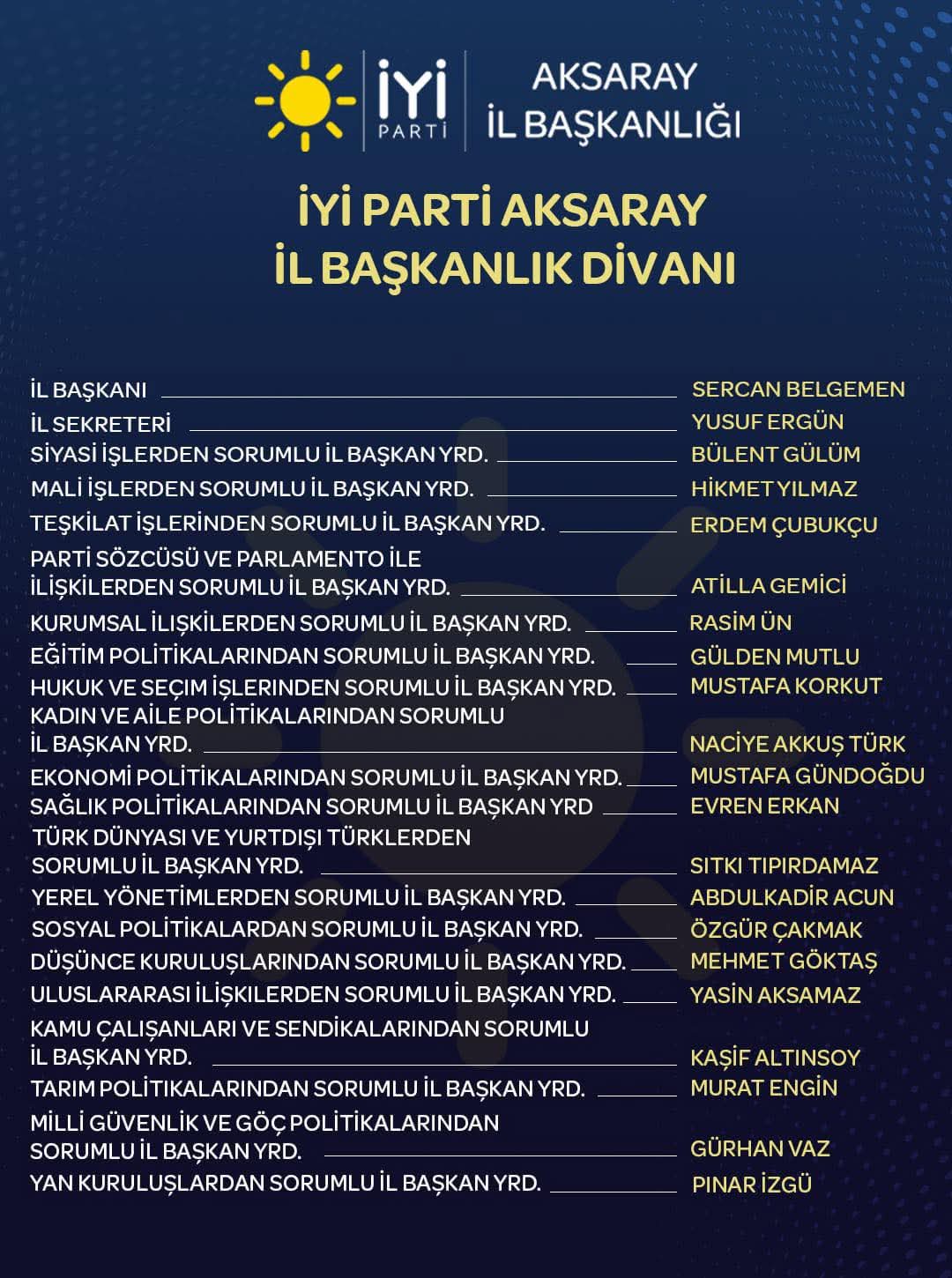 İYİ Parti Aksaray İl Başkanlığı’nda yeni dönem İl Başkanlık Divanı oluşturuldu. İl Başkanı Sercan Belgemen başkanlığında şekillenen yeni divanın, parti teşkilatının kurumsal yapısını güçlendirmesi ve Aksaray’da daha etkin bir siyasal çalışma yürütmesi hedefleniyor.