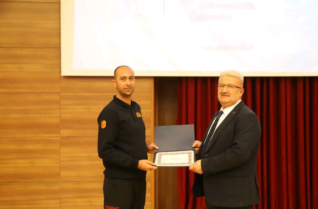UMKE Aksaray Sorumlusu Erhan Yücel de konuşmasında UMKE’nin görev alanını anlattı. 2003 yılında Sağlık Bakanlığı bünyesinde kurulan UMKE’nin, afet ve acil durumlarda medikal kurtarma ve hasta sevk koordinasyonunu sağladığını söyledi. Aksaray’da 115 personel, 3 UMKE aracı ve 1 arazi aracıyla hizmet verdiklerini aktaran Yücel, 6 Şubat sabahı 04.45’te 19 personel ve 5 araçla yola çıktıklarını ve Osmaniye’ye ilk ulaşan ekip olduklarını açıkladı. Enkaz alanında acil müdahale üniteleri kurduklarını, ilk yardım çadırları oluşturduklarını ve ilerleyen süreçte sahra hastanelerinin kurulumunda görev aldıklarını ifade eden Yücel, afet yönetiminde sağlık hizmetlerinin yalnızca klinik değil aynı zamanda insani ve etik bir sorumluluk taşıdığını vurguladı. Koçpınar Elmacık Şehit Halil Köksal İlkokulu Müdürü Eyüp Abay da konuşmasında sivil toplumun afetlerdeki rolüne dikkat çekti. Daha önce 2020 Elazığ depreminde de sahada görev aldığını belirten Abay, sivil toplum kuruluşlarının afet öncesi hazırlık, afet anı müdahale ve afet sonrası iyileştirme süreçlerinde büyük önem taşıdığını aktardı. Abay, sahada karşılaştıkları yıkım manzaralarının kendilerinde derin izler bıraktığını ifade ederek, afetlere karşı bilinçli ve organize bir toplum yapısının gerekliliğine dikkat çekti. Konuşmaların ardından panelistler, katılımcıların sorularını yanıtladı. Program, panelistlere teşekkür belgesi takdim edilmesi ve günün anısına çekilen hatıra fotoğrafıyla sona erdi.