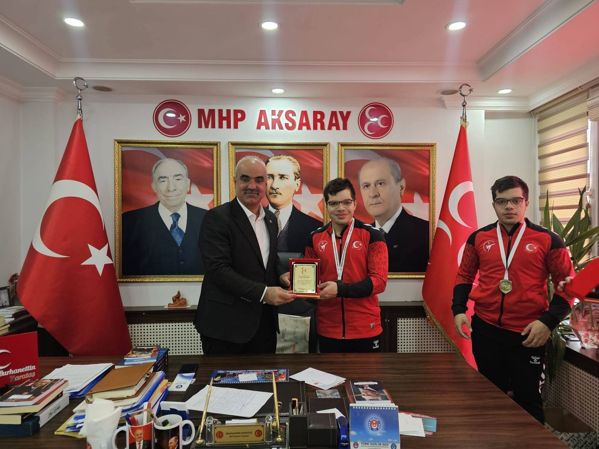 Yeşilay Parapoomsae Tekvando Türkiye Şampiyonası P23 Senkron Büyükler kategorisinde Türkiye şampiyonu olarak Aksaray’a büyük gurur yaşatan engelli sporcular İbrahim Enes Arık ve İsmail Eren Arık, antrenörleri Mesut İrge ile birlikte Aksaray Otizm Dayanışma Derneği Başkanı Cennet İnceöz eşliğinde Milliyetçi Hareket Partisi Aksaray İl Teşkilatını ziyaret etti.